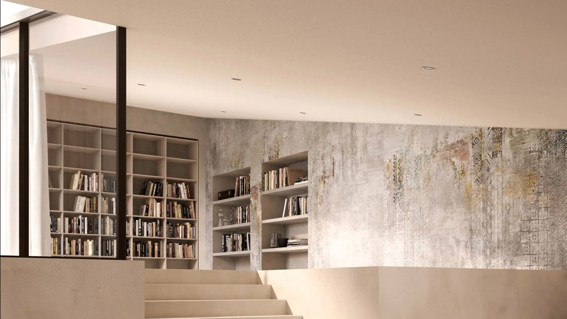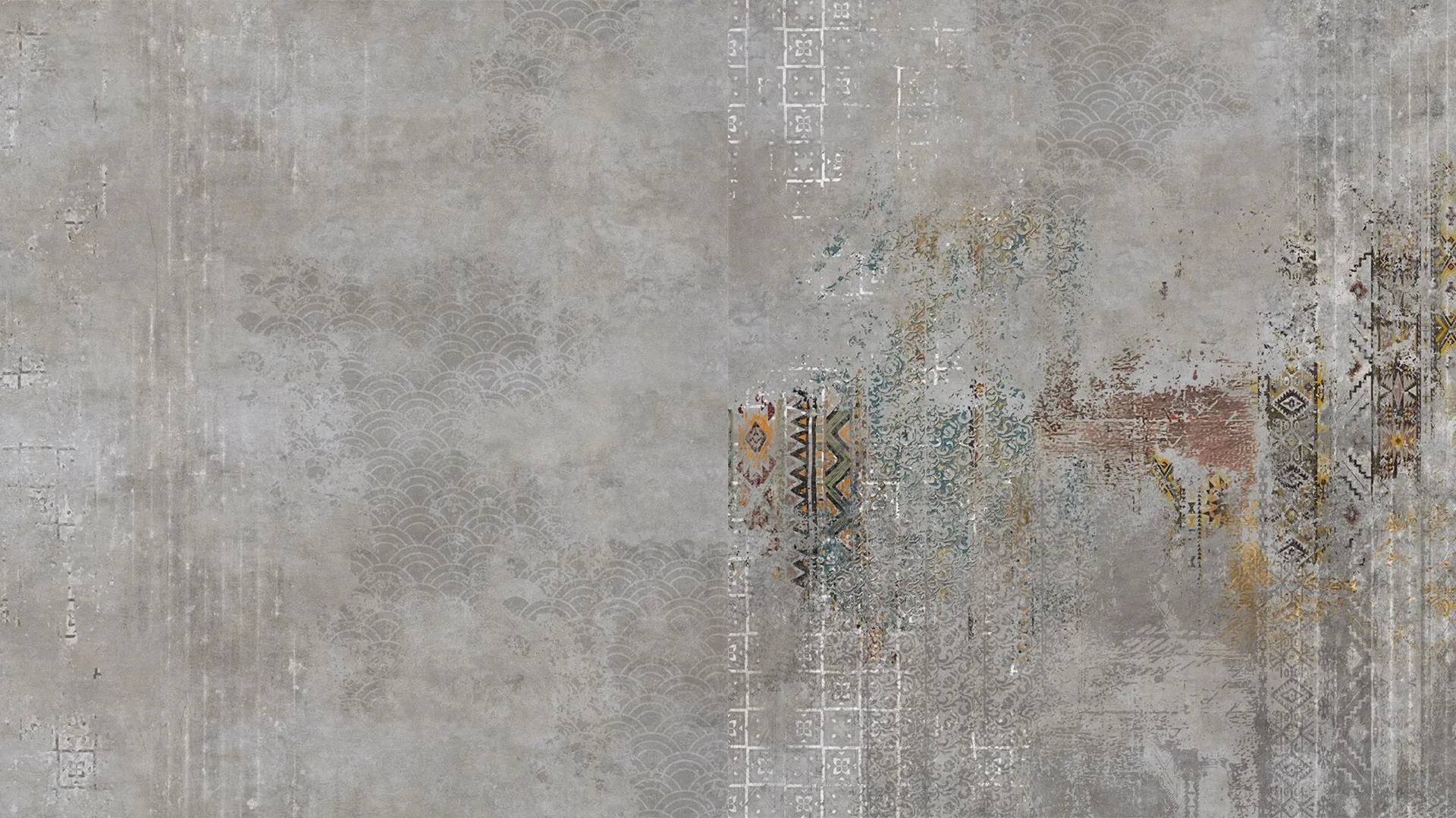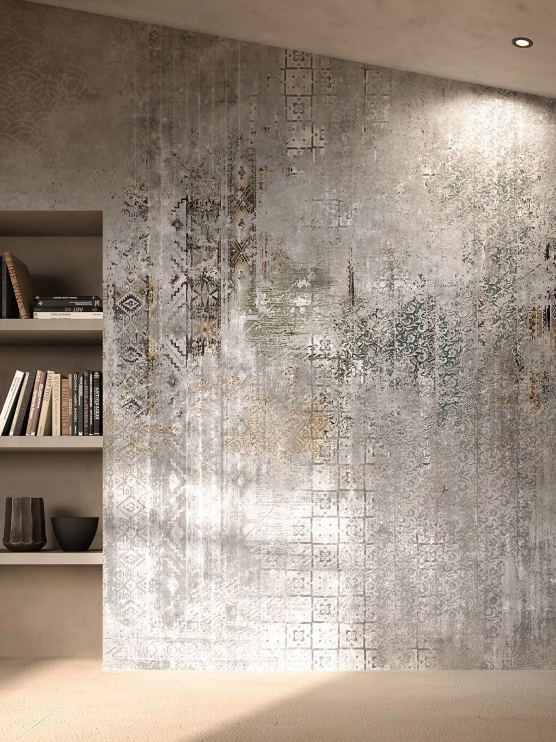 La carta da parati presenta una finitura particolare, ispirata all’effetto del délavé.