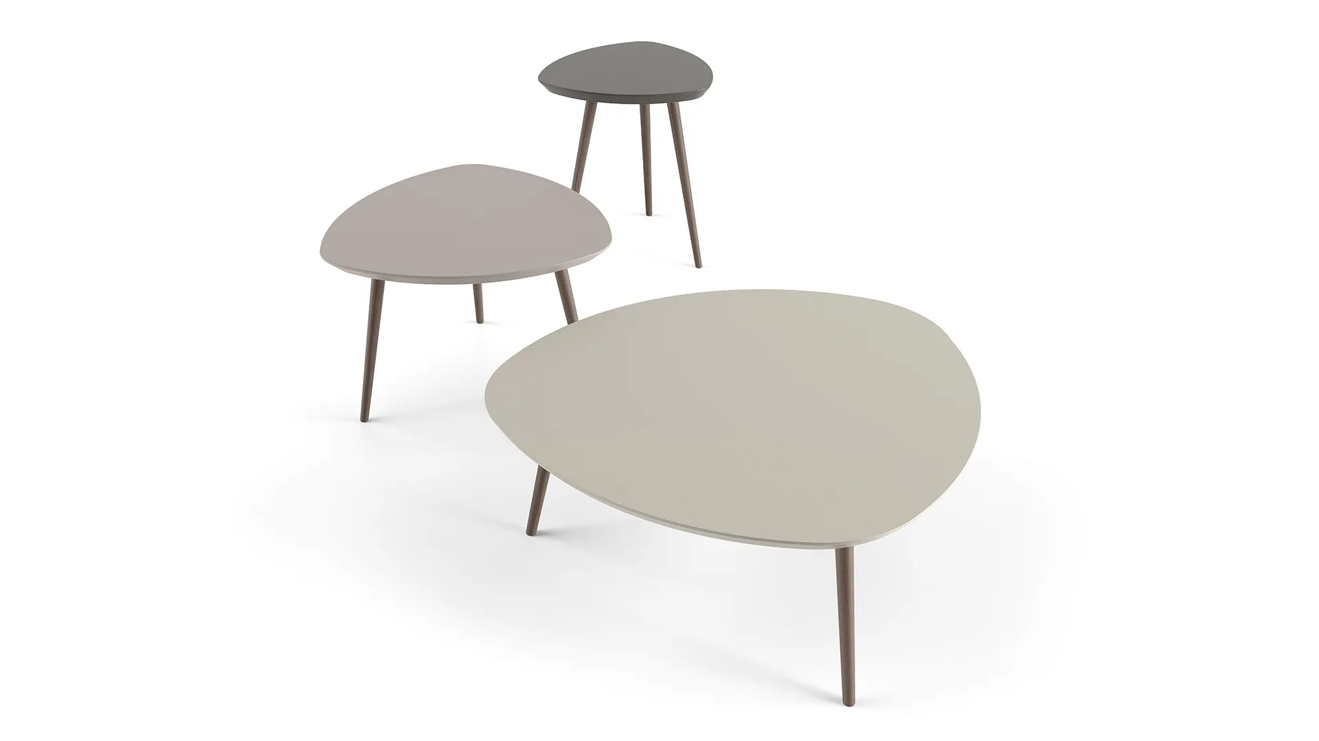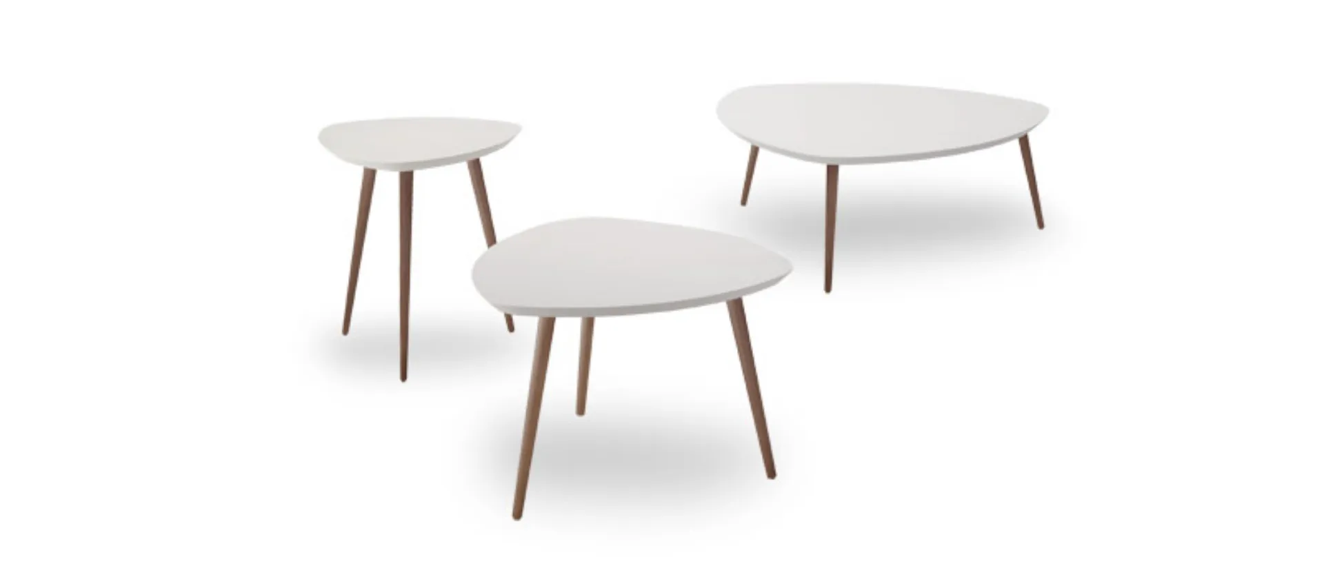 Tavolino moderno dal design scandinavo costituito da un piano in MDF pantografato con bordo a 45° e forma triangolare con angoli arrotondati e sorretto da tre gambe in legno a sezione circolare.