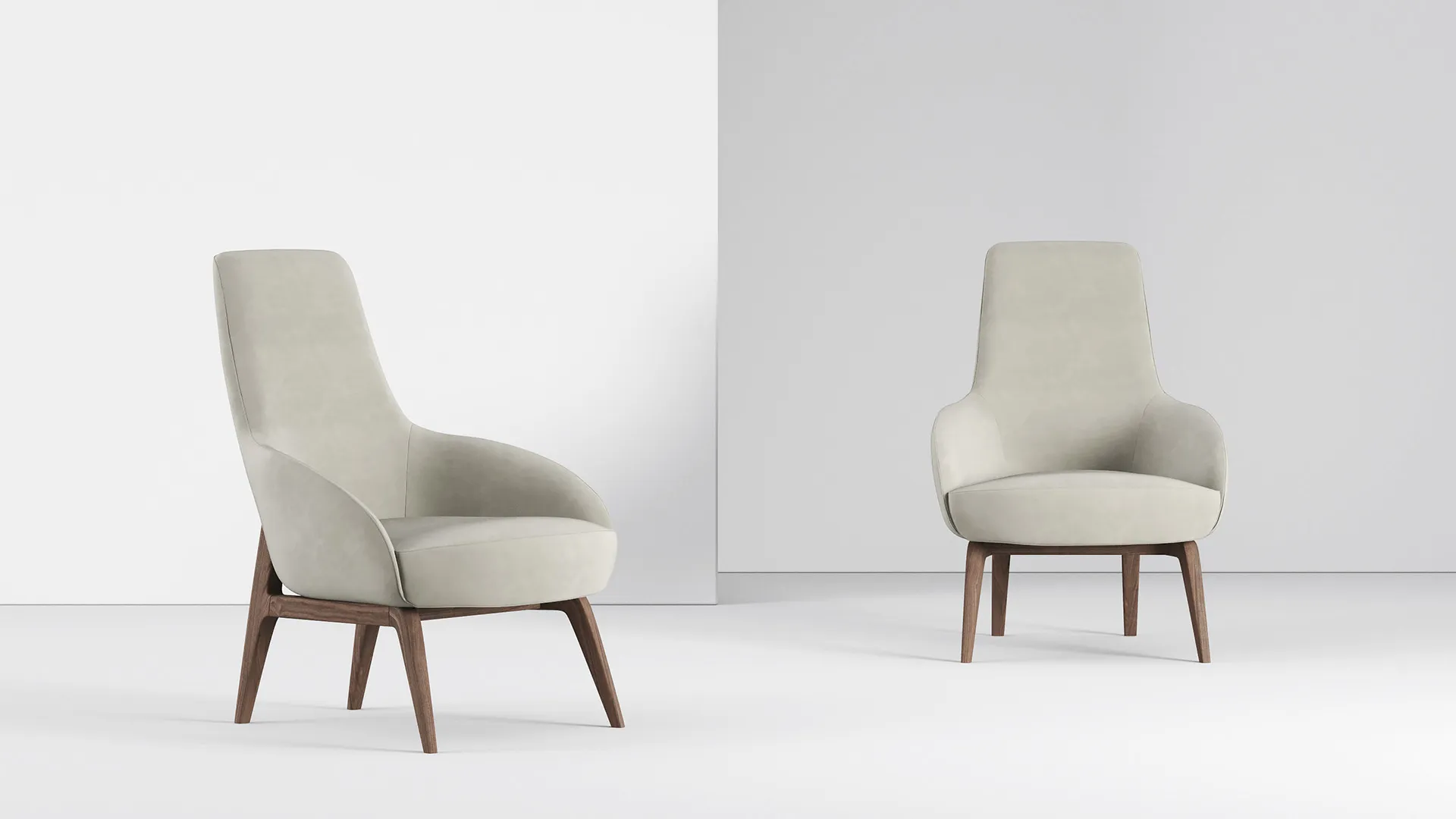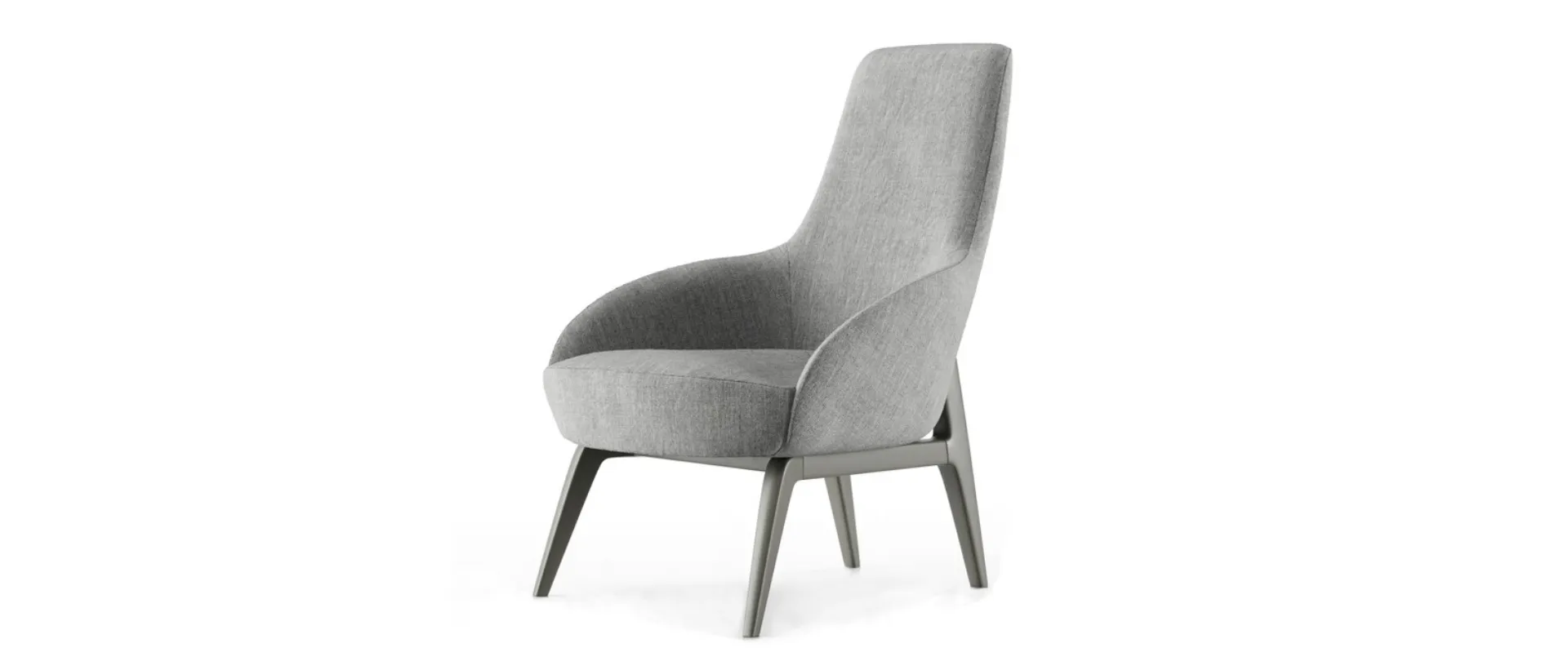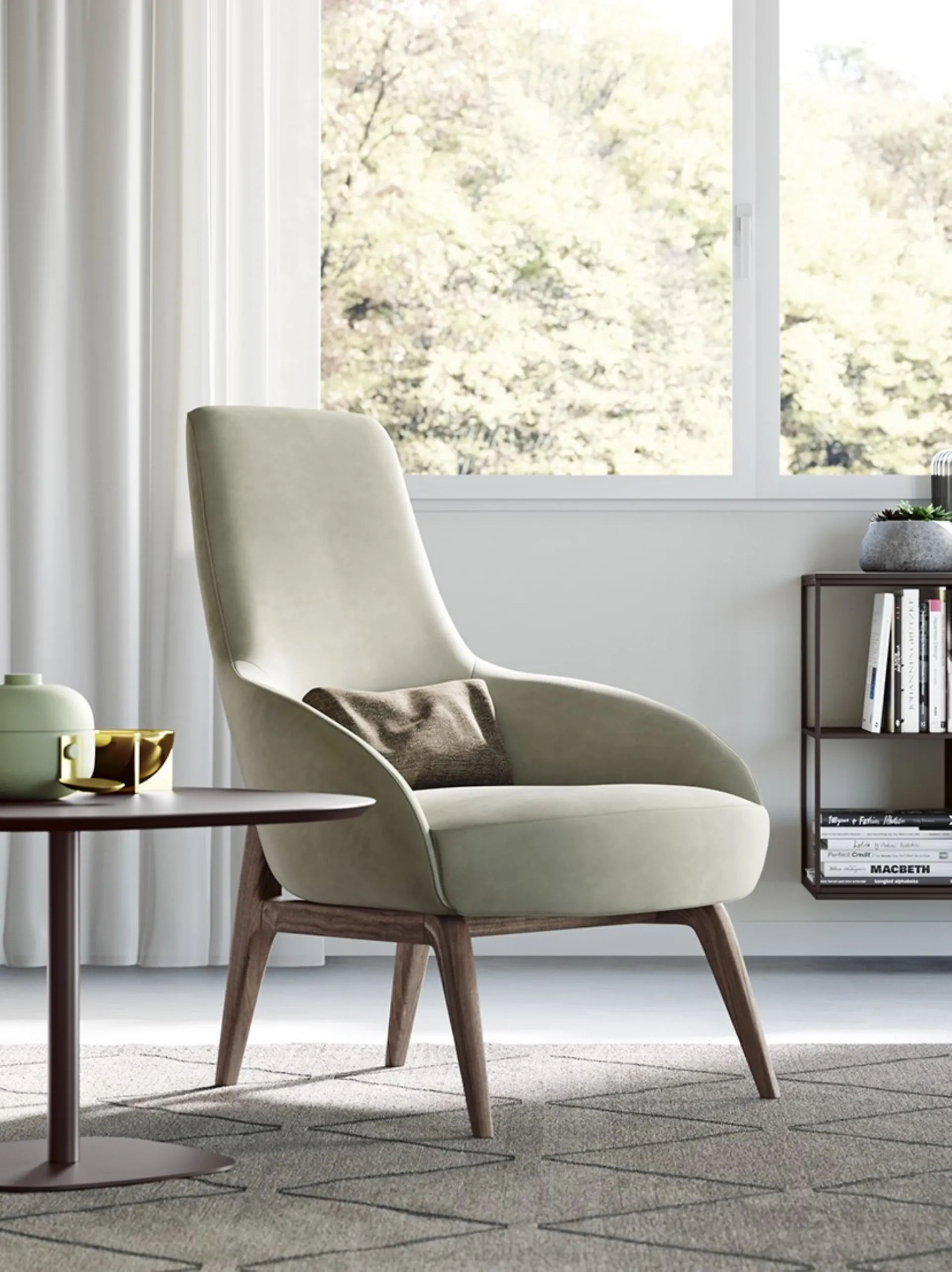 La sua forma avvolgente conferisce un ottimo comfort di seduta. Realizzata con struttura in legno e imbottitura in poliuretano espanso.