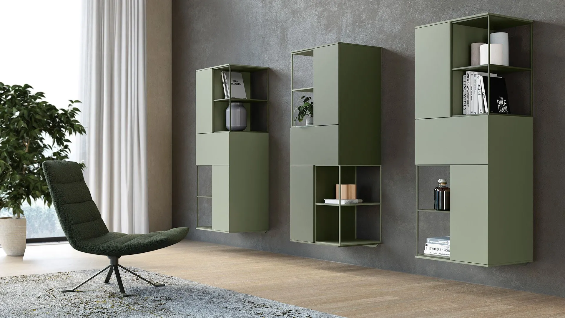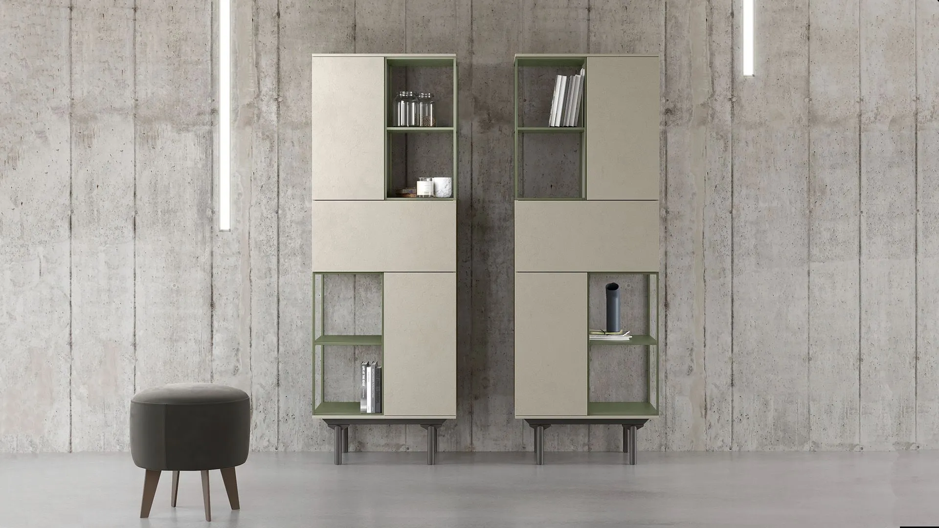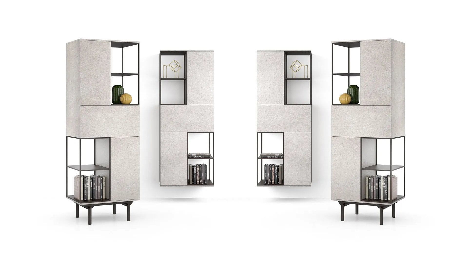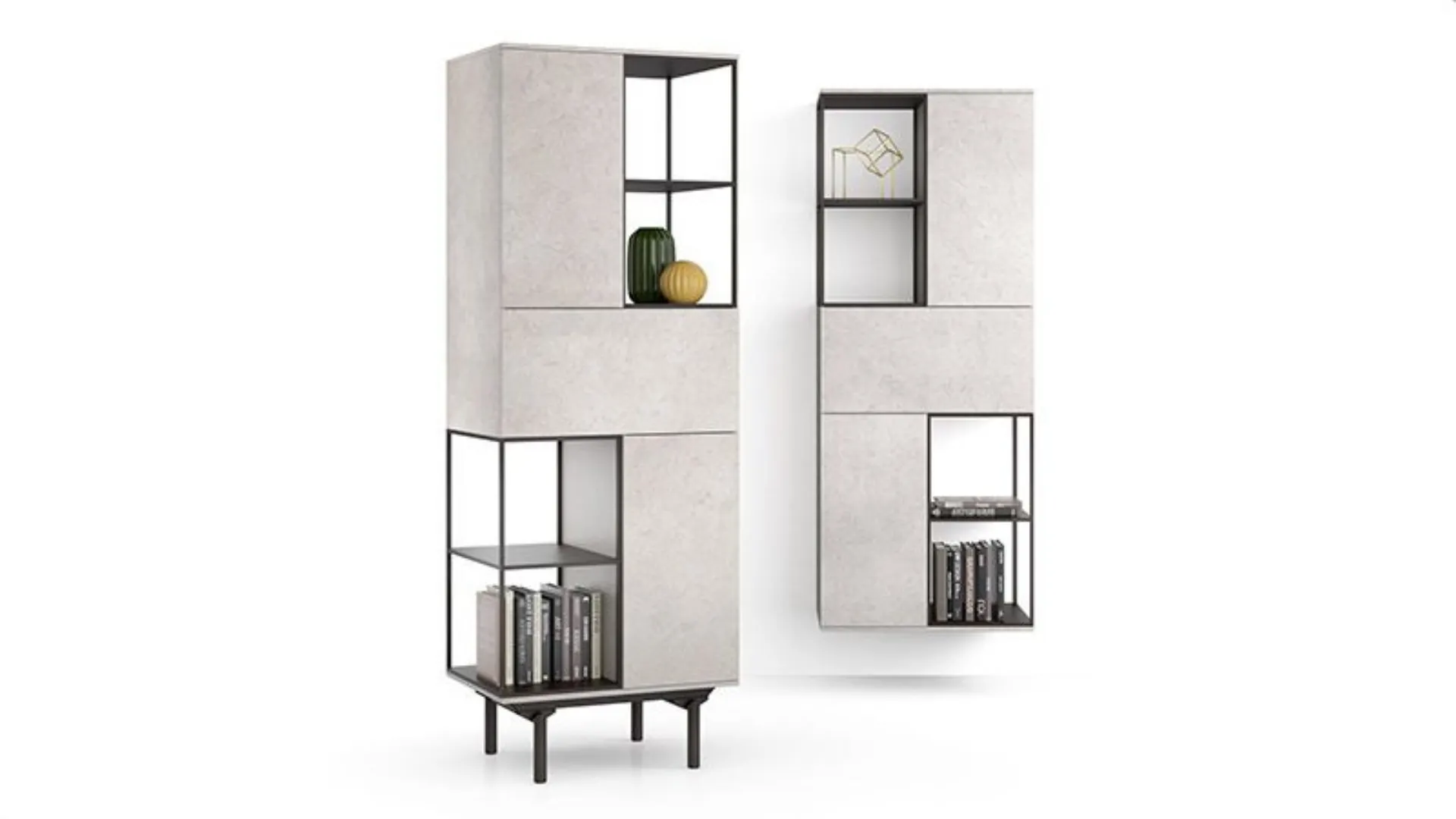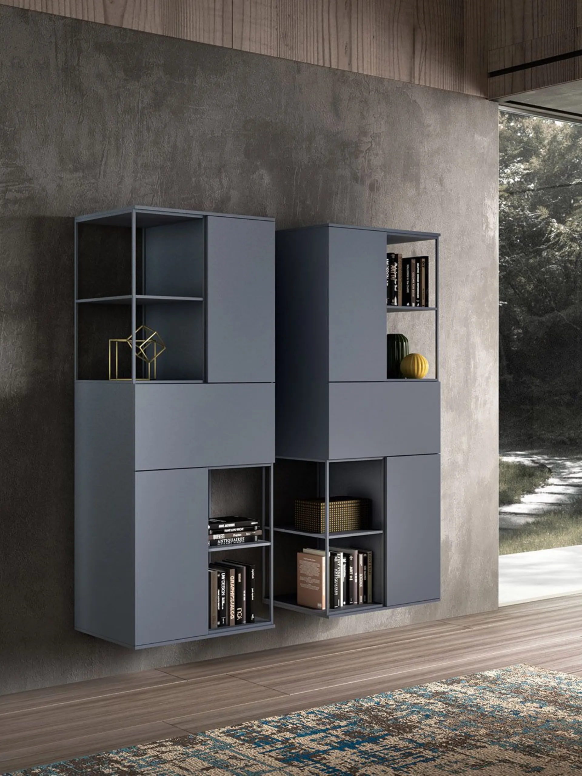 Un gioco di elementi chiusi e aperti realizzati con materiali e colori diversi, sono le caratteristiche costruttive della libreria Lexia.