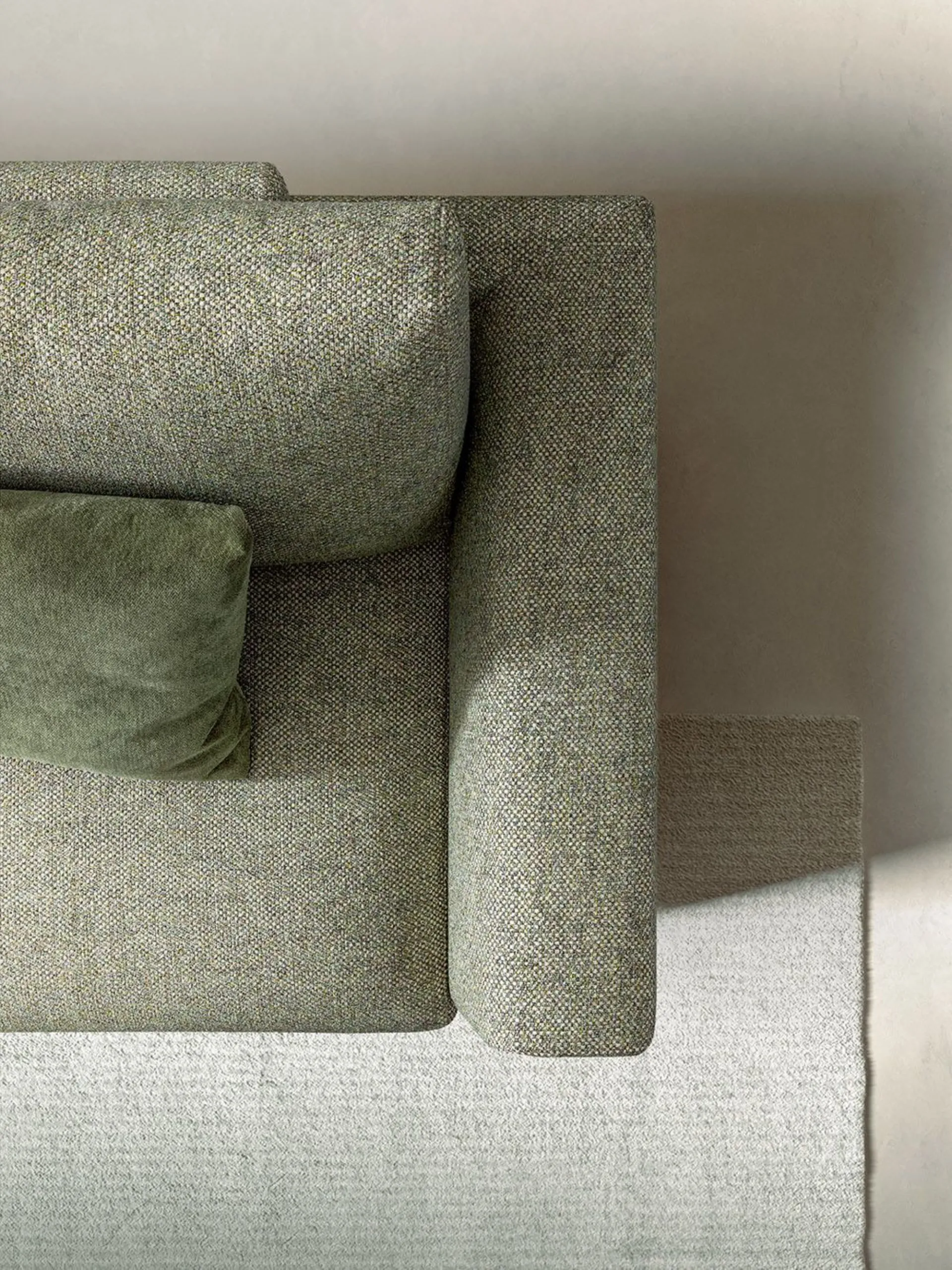 L’armonia cromatica di questo ambiente gioca tutto sul contrasto elegante tra il verde petrolio del divano e la base neutra che lo circonda. Norman, sofà, dalle linee moderne e avvolgenti, diventa il protagonista della stanza: un colore deciso e sofisticato, capace di trasmettere carattere senza risultare invadente.