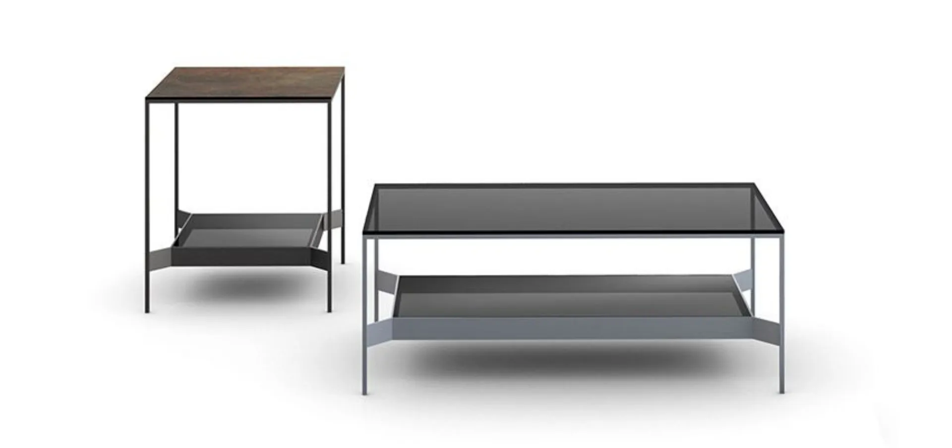 Il piano superiore può essere realizzato in nobilitato, in laccato, in vetro fumè e in Laminam.