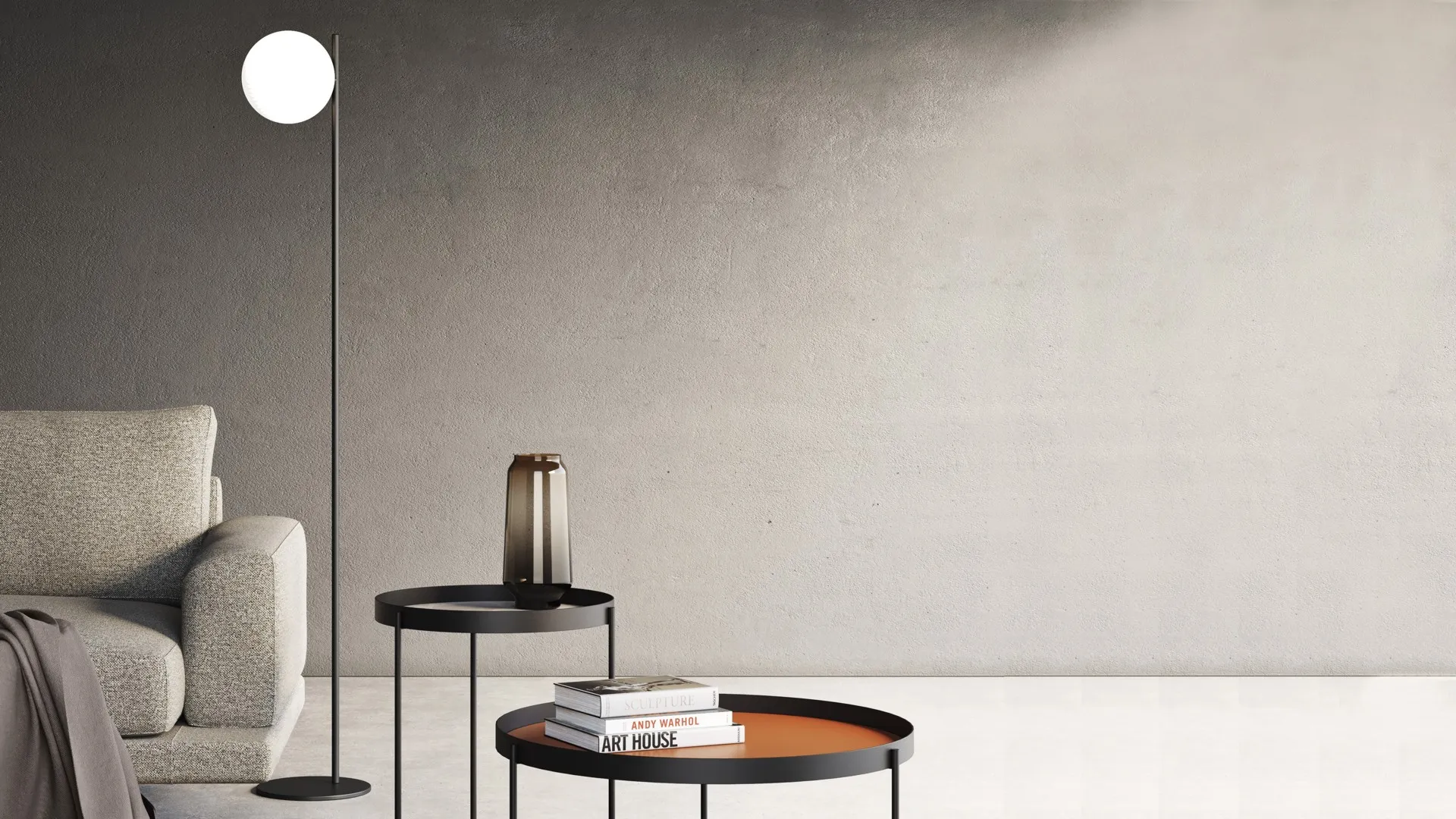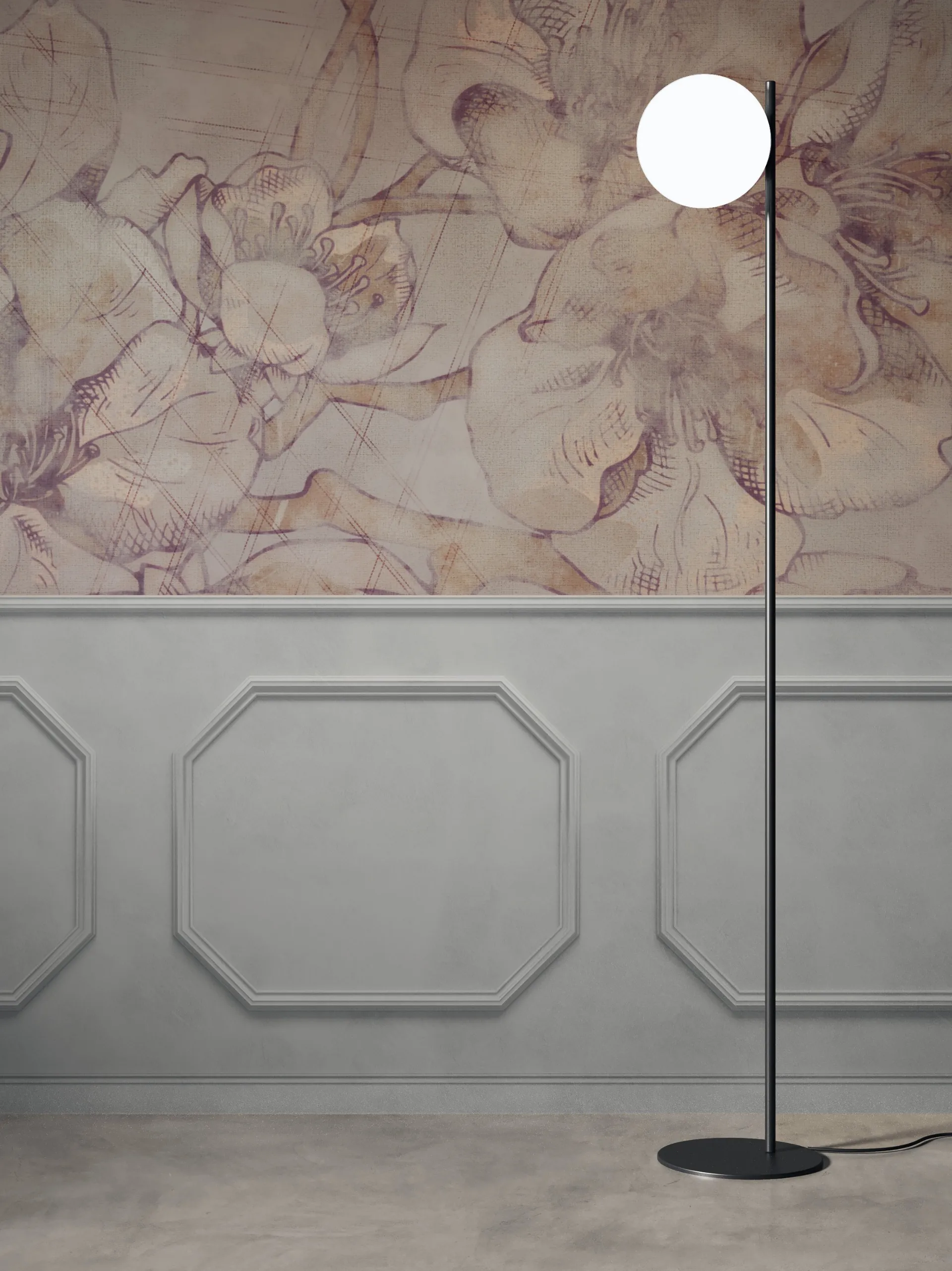 La struttura in metallo può essere realizzata con la finitura grigio antracite goffrato o avorio champagne, la sfera è in vetro satinato.