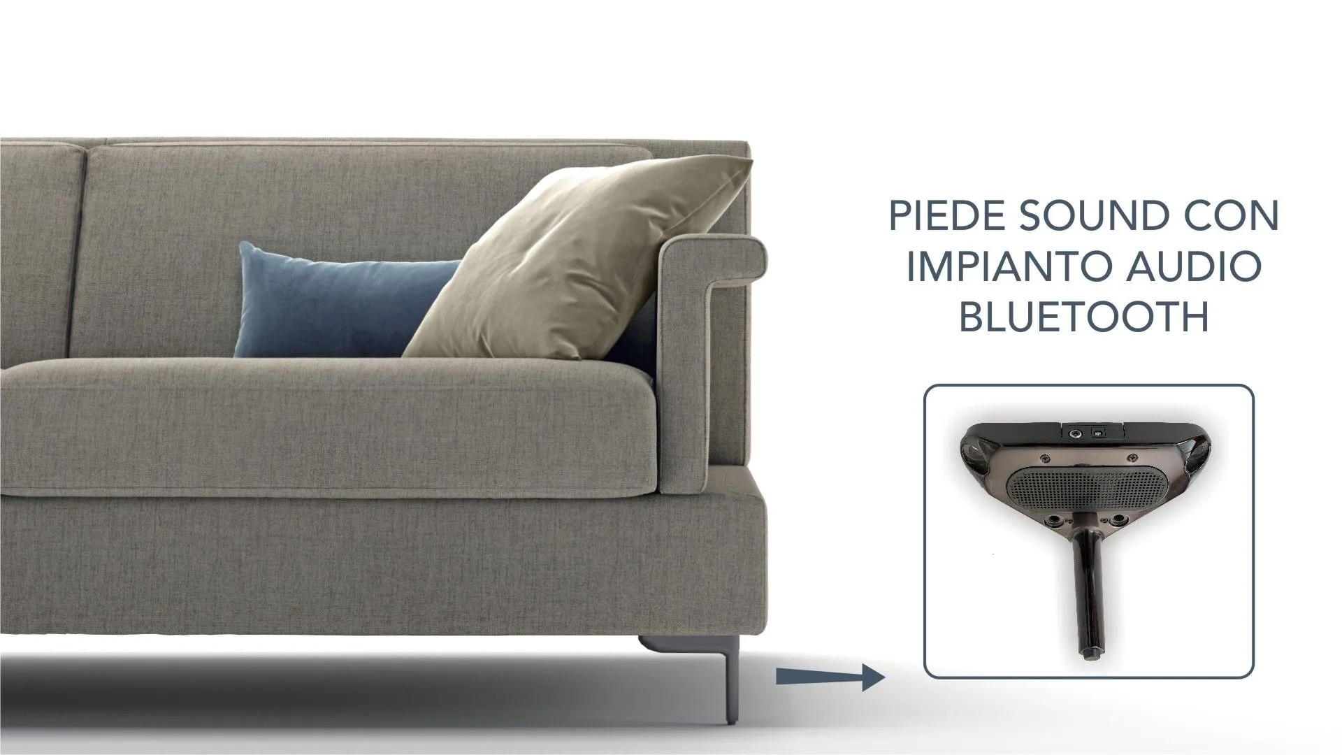I piedi Sound sono forniti con l’impianto audio a due vie con collegamento Bluetooth e completo di trasformatore da 12 V. Questi piedi completi di casse acustiche vengono forniti a coppia e sono posizionabili frontalmente o lateralmente nel divano o nella composizione.