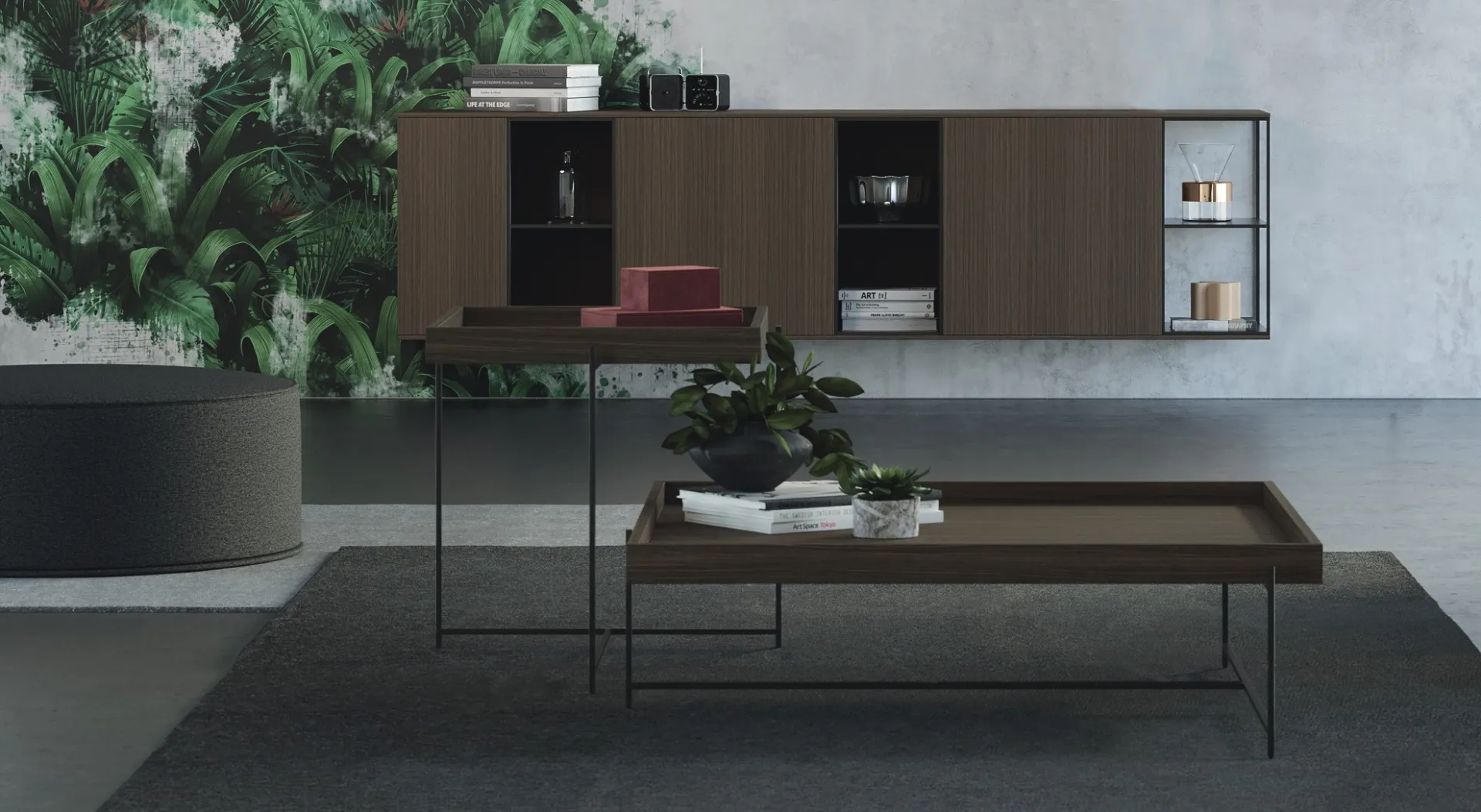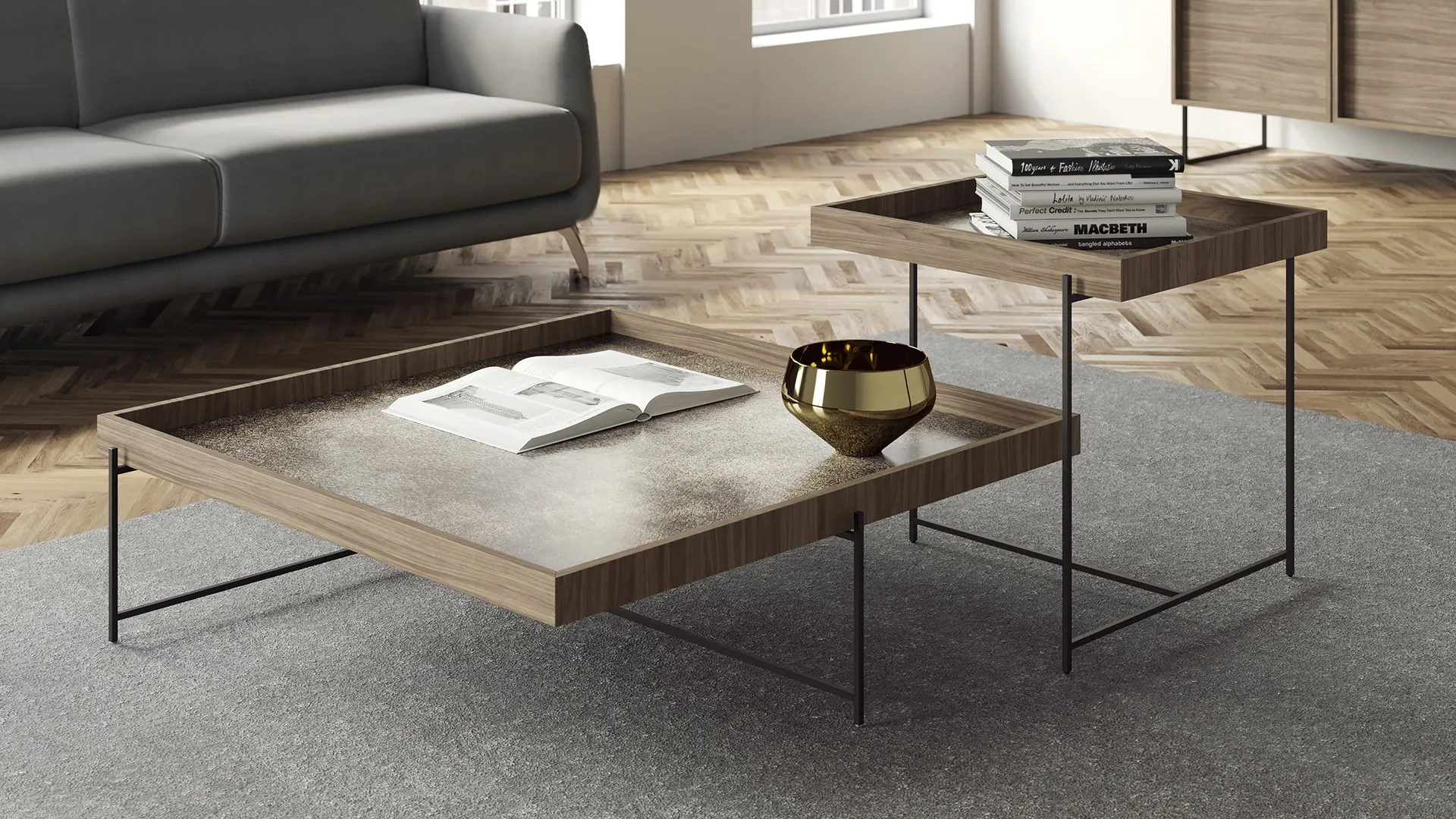 Il piano a vassoio è realizzato in nobilitato e può essere personalizzato con l'integrazione di un inserto disponibile nelle finiture laccate o con un vetro extra chiaro o serigrafato.