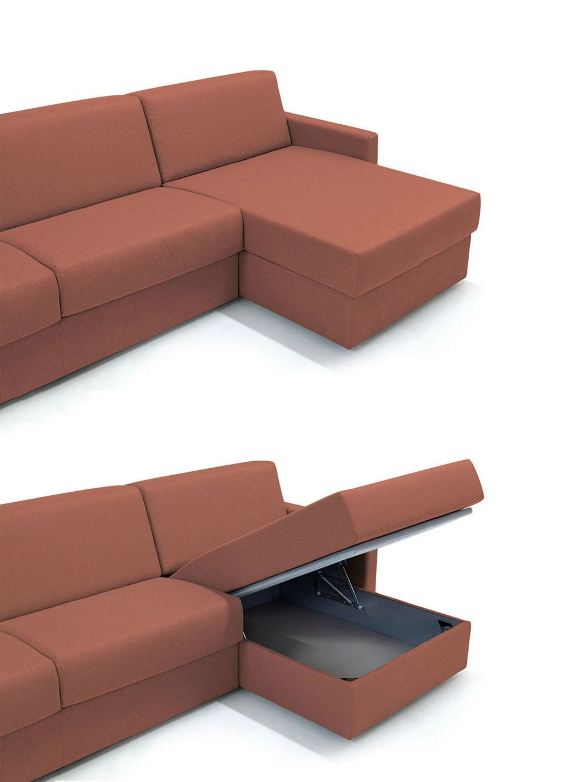 Una volta aperto, il vano rivela un ampio spazio interno, perfetto per riporre cuscini, coperte e altri accessori, mantenendo l’ambiente ordinato e funzionale. Questo dettaglio combina praticità e design, aggiungendo un tocco di versatilità all’eleganza del divano.